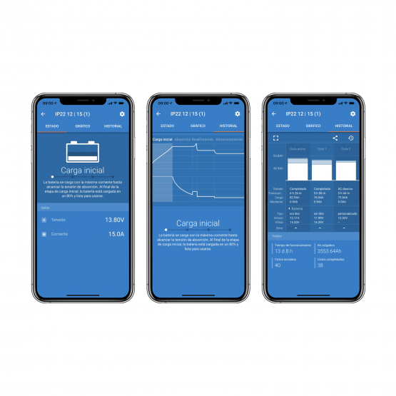 El cargador de baterías Blue Smart IP22 es la solución inalámbrica para monitorizar la tensión y la corriente, cambiar los ajustes y actualizar el cargador cuando aparecen nuevas funciones.