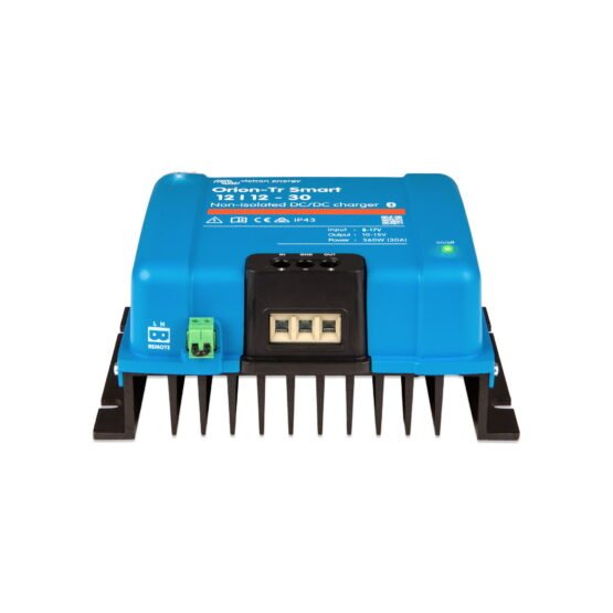 Para su uso en sistemas duales de batería en vehículos o embarcaciones en los que el alternador y la batería de arranque se utilizan para cargar la batería de servicio. La unidad puede monitorizarse y programarse vía Bluetooth y se puede controlar a distancia mediante un interruptor on/off remoto. El cargador Orion-Tr Smart puede usarse en sistemas de 12 ó 24 V y es adecuado tanto para baterías de plomo-ácido como de litio. Hay modelos disponibles de hasta 400 W y se puede conectar un número ilimitado de unidades en paralelo para incrementar la potencia de salida.