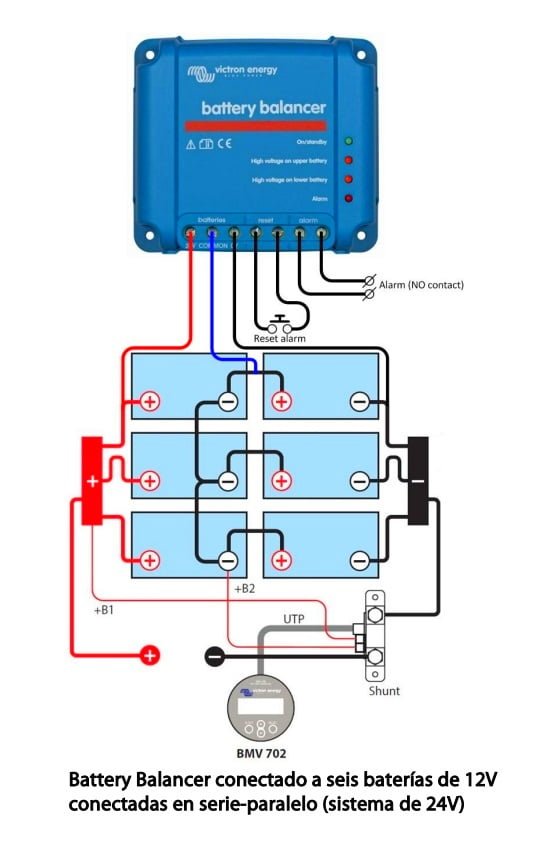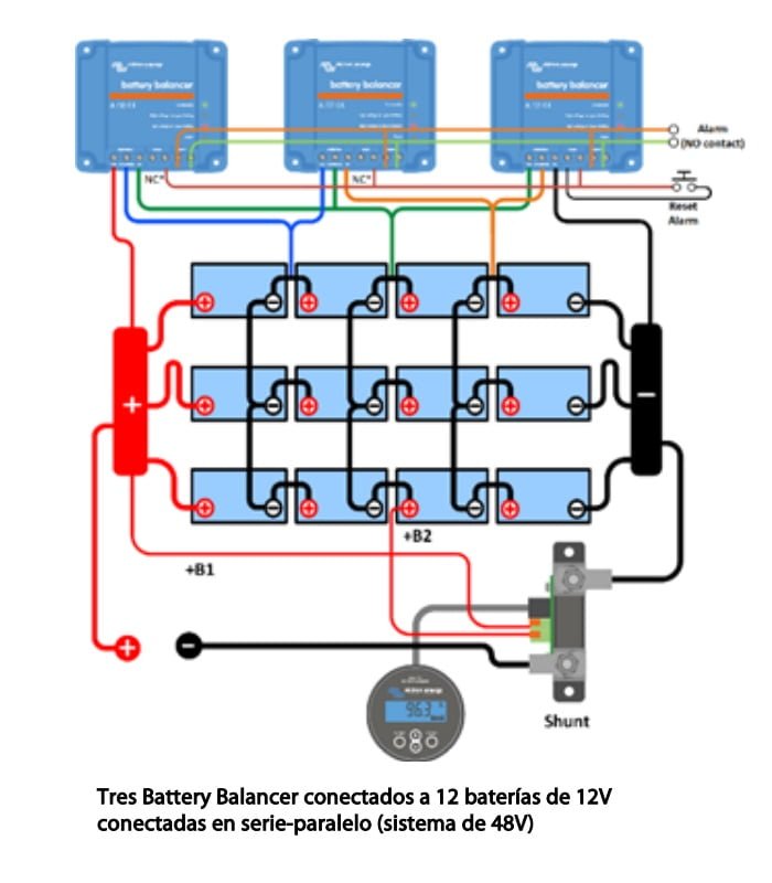 El Equilibrador de Baterías (Battery Balancer) equilibra el estado de la carga de dos baterías de 12 V conectadas en serie, o de varias cadenas paralelas de baterías conectadas en serie. En el caso de que la tensión de carga de un sistema de baterías de 24 V aumente por encima de los 27 V, el Battery Balancer se activará y comparará la tensión que llega a las dos baterías conectadas en serie. El Battery Balancer retirará una corriente de hasta 1 A de la batería (o baterías conectadas en paralelo) que tenga la tensión más alta. El diferencial resultante de corriente de carga garantizará que todas las baterías converjan en el mismo estado de carga. Si fuese necesario, se pueden poner varios equilibradores en paralelo. Una bancada de baterías de 48 V puede equilibrarse con tres Battery Balancer.