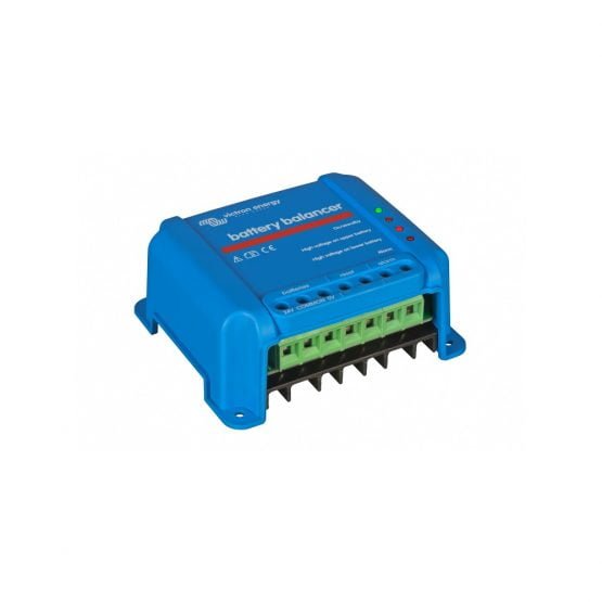 El Equilibrador de Baterías (Battery Balancer) equilibra el estado de la carga de dos baterías de 12 V conectadas en serie, o de varias cadenas paralelas de baterías conectadas en serie. En el caso de que la tensión de carga de un sistema de baterías de 24 V aumente por encima de los 27 V, el Battery Balancer se activará y comparará la tensión que llega a las dos baterías conectadas en serie. El Battery Balancer retirará una corriente de hasta 1 A de la batería (o baterías conectadas en paralelo) que tenga la tensión más alta. El diferencial resultante de corriente de carga garantizará que todas las baterías converjan en el mismo estado de carga. Si fuese necesario, se pueden poner varios equilibradores en paralelo. Una bancada de baterías de 48 V puede equilibrarse con tres Battery Balancer.