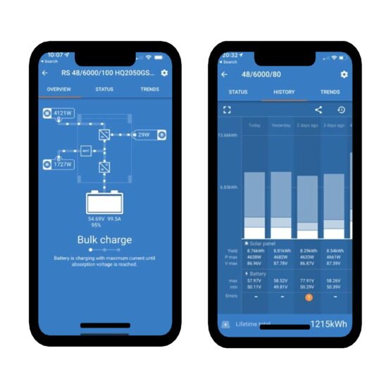 El Multi RS Solar 48/6000 es un inversor/cargador de 48 V y 6 kVA con entrada de 450 VCC y 4 kWp FV. Gracias a su tecnología de alta frecuencia y a su nuevo diseño, este potente inversor solo pesa 11 kg. Además, tiene una eficiencia excelente, bajo consumo de energía en reposo y un funcionamiento muy silencioso. La pantalla muestra parámetros de la batería, el inversor y el controlador de carga solar. Se puede acceder a estos parámetros con un smartphone u otro dispositivo con Bluetooth a través de la aplicación VictronConnect.