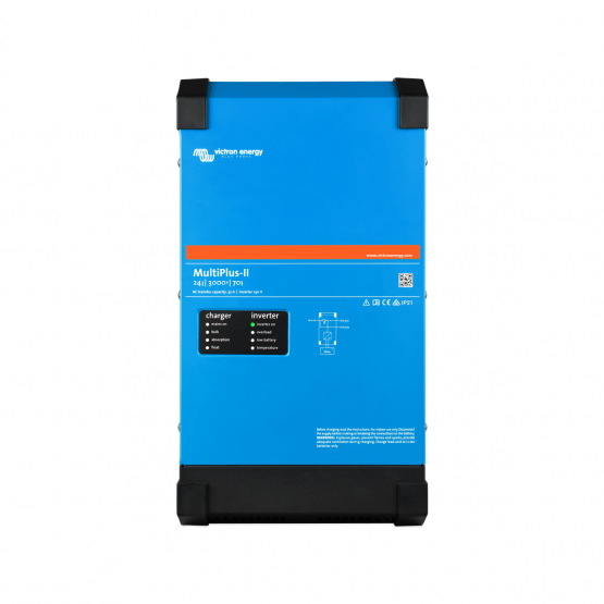 El MultiPlus-II combina un inversor y un cargador en una sola y elegante unidad. Sus características incluyen un inversor de onda sinusoidal pura, carga variable, tecnología PowerAssist híbrida, además de múltiples características para su integración en distintos sistemas. Este inversor tiene todas las características del MultiPlus y además la opción de optimizar el autoconsumo con sensor de corriente externa, anti isla integrado y una lista cada vez mayor de países que ya lo han aprobado. Los inversores Victron cuentan con 5 años de garantía.