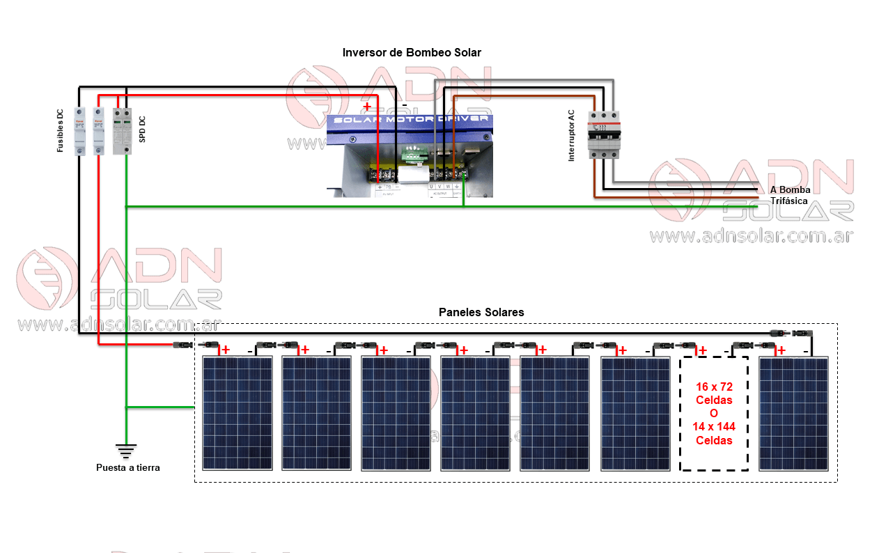 Este kit de energía solar permite alimentar una bomba de agua directamente con la energía de paneles solares variando la frecuencia de salida del inversor y velocidad de rotación de la bomba en función de la radiación solar disponible.
