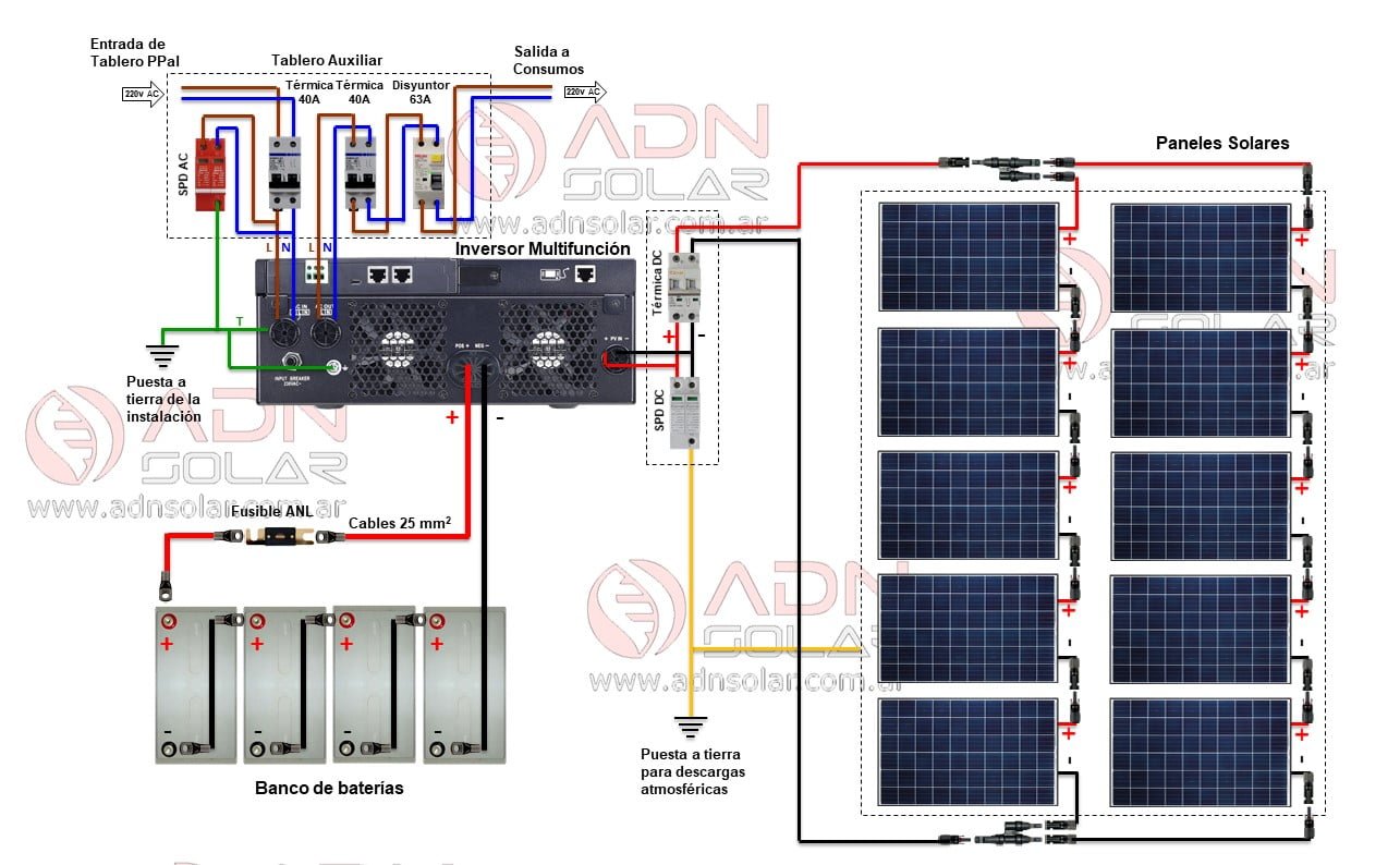 Este kit de energía solar abastecerá su vivienda con la energía solar disponible, de acuerdo a la capacidad instalada de paneles solares, y tomara de la red externa solo la energía faltante para cubrir su consumo en todo momento (Modo Solar+Red o Solar+Batería+Red). Para lograr esto el inversor se sincroniza con la frecuencia de operación de la red externa. Ante un corte de suministro, en forma instantánea el sistema pasara al modo Solar+Batería, continuara abasteciendo los consumos preferentemente con energía solar si esta disponible y tomara del banco de baterías la energía faltante.