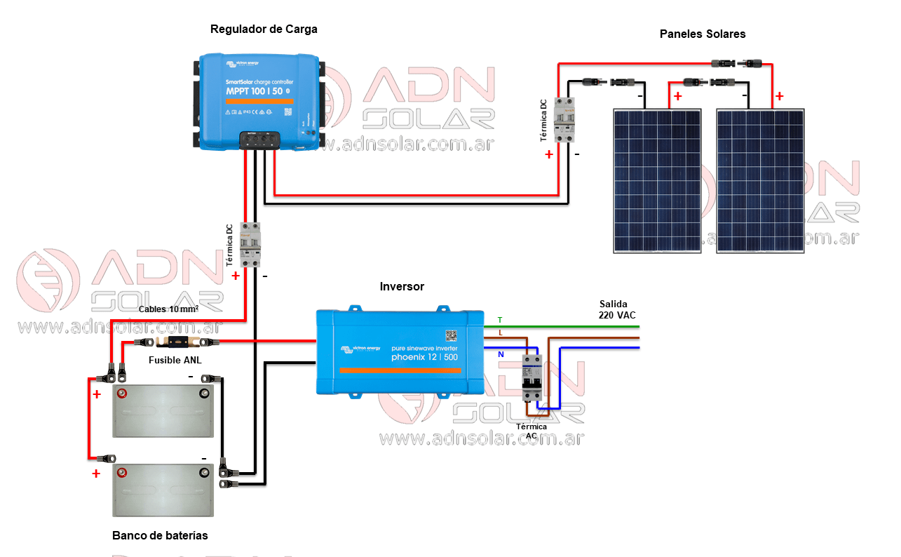 Los paneles solares reciben la energía del sol y la transforman en corriente continua, luego la corriente pasa por el regulador de carga solar y es almacenada dentro de las baterías. Cuando es necesario abastecer los consumos, la energía almacenada en las baterías junto con la energía captada por los paneles es transformada por el inversor en corriente alterna 220v. El sistema solar abastecerá los consumos con la energía solar disponible, de acuerdo a la capacidad instalada de paneles solares, y tomara del banco de baterías solo la energía faltante.