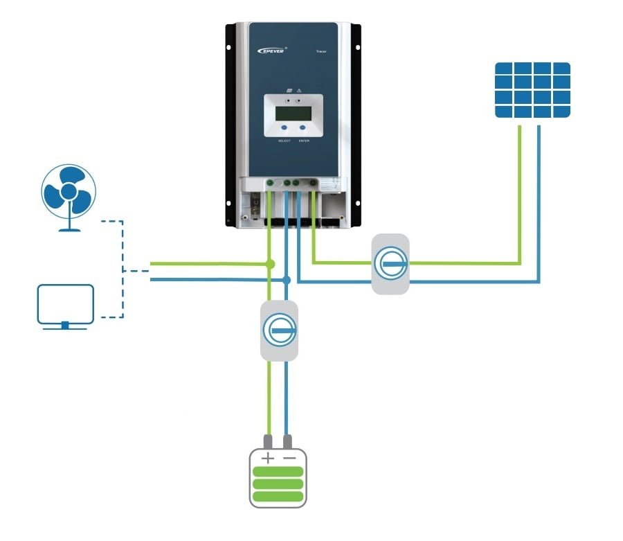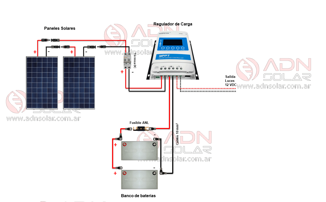 - La corriente pasa por el regulador de carga solar y es almacenada dentro de las baterías.