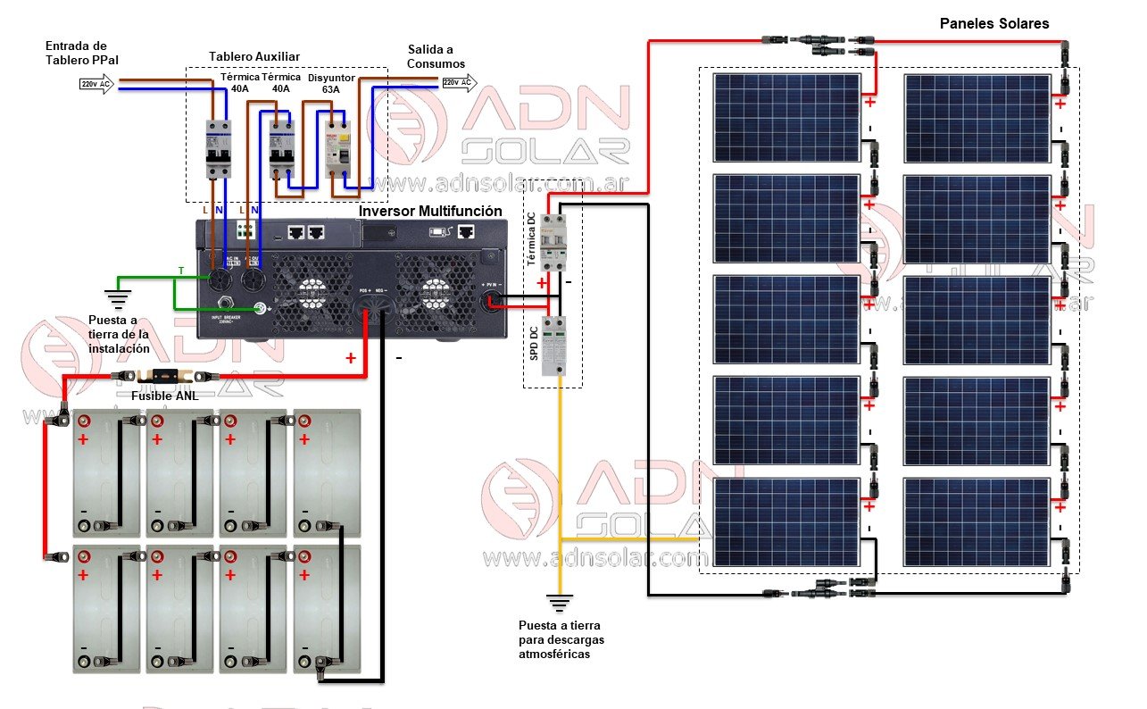 - Cuando es necesario abastecer los consumos, la energía almacenada en las baterías junto con la energía captada por los paneles es transformada por el inversor en corriente alterna 220v.