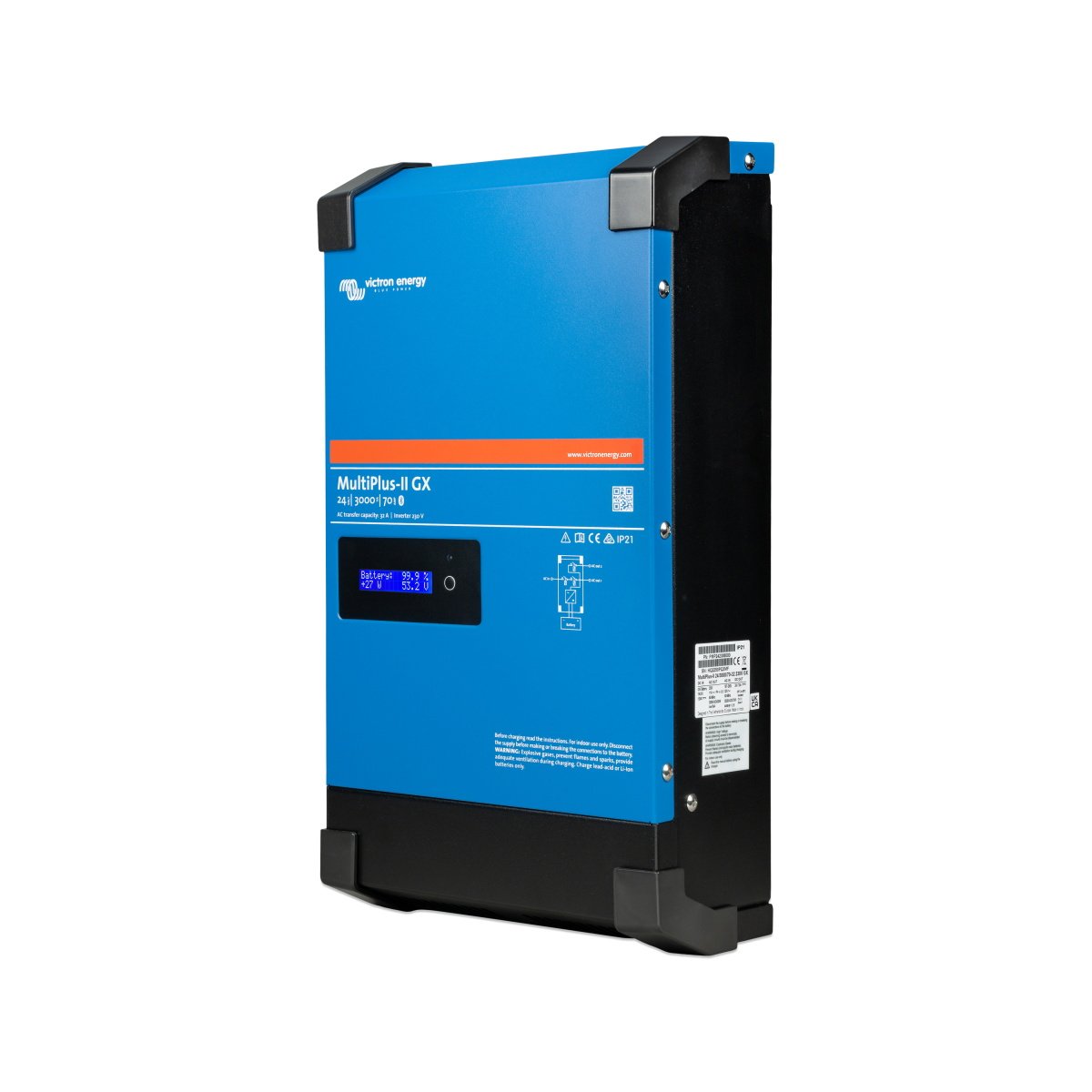 El MultiPlus-II GX integra un inversor/cargador MultiPlus-II y un dispositivo GX con una pantalla de 2 x 16 caracteres. La pantalla muestra parámetros de la batería, el inversor y el controlador de carga solar. Se puede acceder a estos parámetros con un smartphone u otro dispositivo con WiFi. El dispositivo GX integrado incluye una interfaz BMS-Can, un puerto USB, un puerto Ethernet y un puerto VE.Direct.