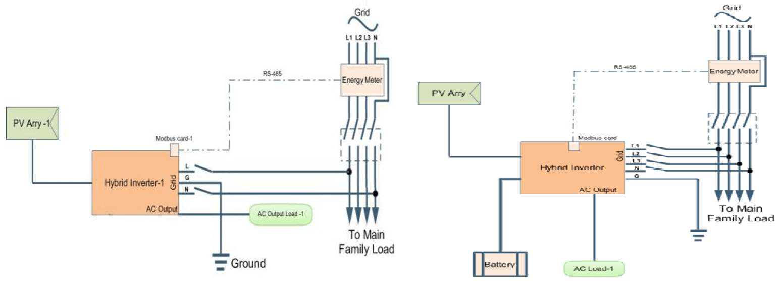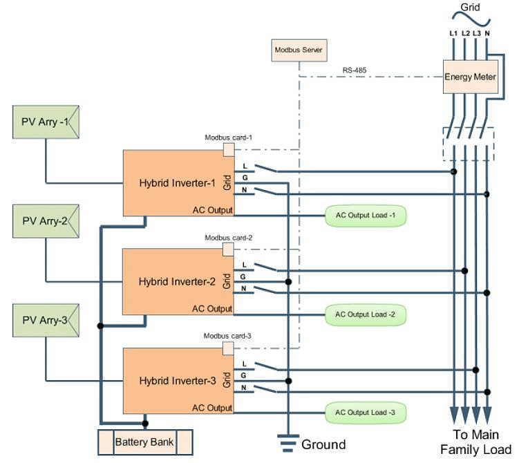 Para la aplicación de tres inversores: Equipados con tarjetas Modbus, tres inversores híbridos están conectados al medidor de energía con puerto de comunicación RS485. Como centro de control, el servidor Modbus controlará la generación de energía y la carga de la batería de tres inversores a través de la tarjeta Modbus para un autoconsumo exitoso.
